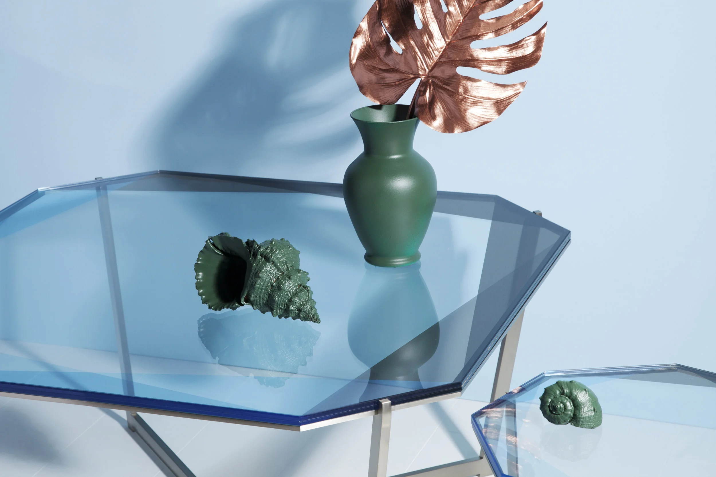 Inspired by the reflections of light and transparencies found in gemstones, these metal and glass tables translate facets through layers of color and varying opacity. Each table base is designed as a setting with pronged connections to its glass tabletop. Each tabletop color-way conveys the throw of light over a stone’s surface by varying its color saturation from light to dark.